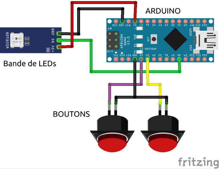 - la mise en place du câblage entre l’Arduino, le bandeau LED et les boutons,